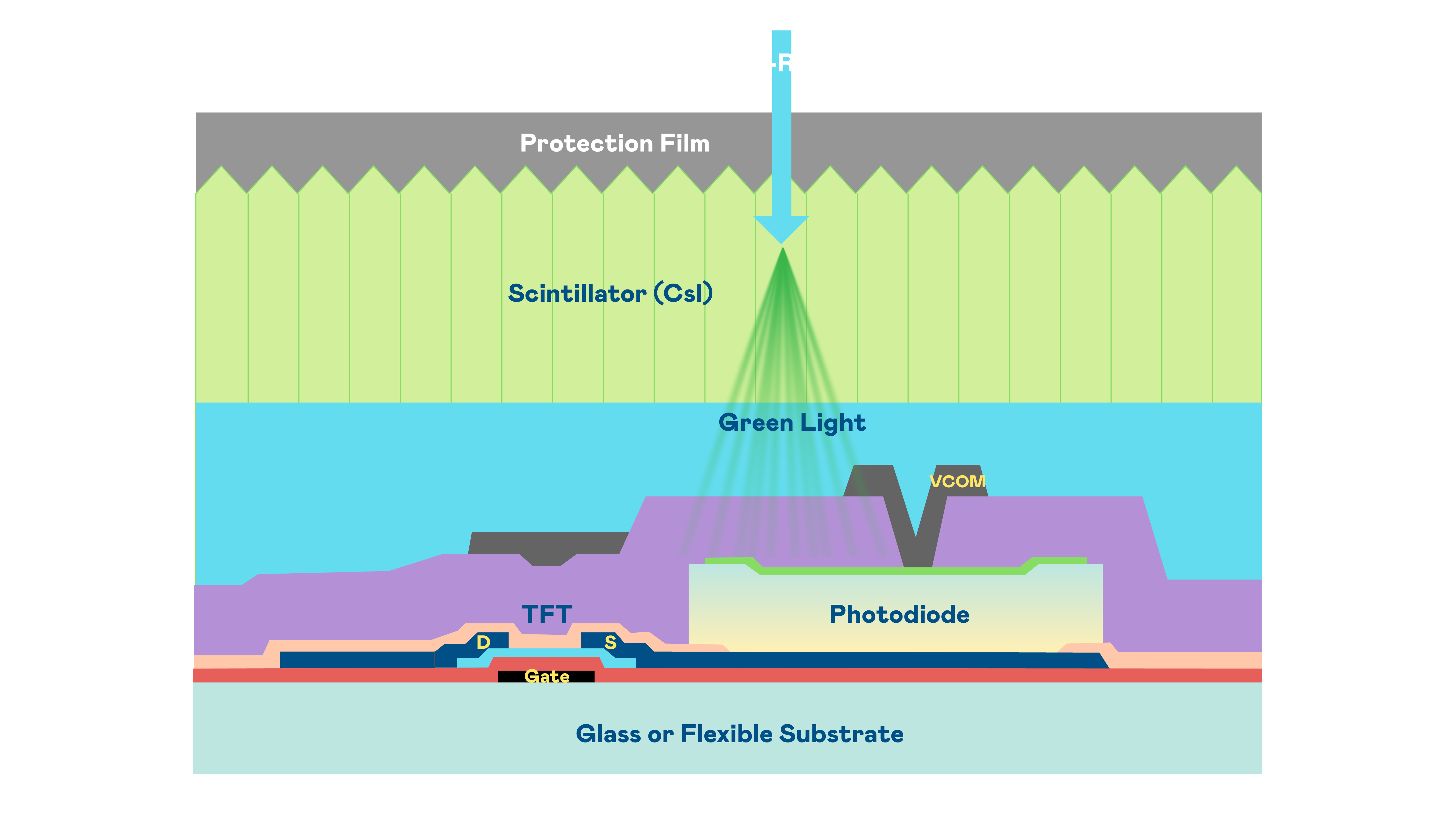成人看片7777.tv的X光影像感測陣列使用薄膜電晶體 (TFT) 作為每個像素的讀取開關,搭配光電二極體(Photodiode)的光電轉換元件,用以感測X光影像訊號。
